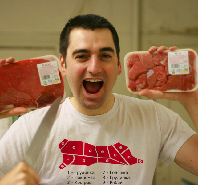 С футболкой со схемой разделки мясной туши очень удобно ходить самому или отправлять мужчину на рынок.Достаточно чтобы на нем была эта футболка, а в памяти у него засела цифра соответствующая той части убиенного живтного за которой его послали.